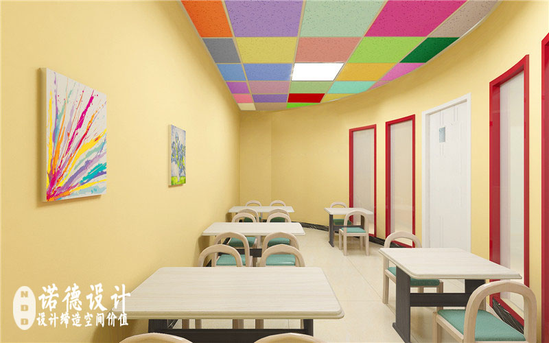 2、少儿培训班设计空间色彩搭配要靓丽富有生机和活力,我们知道靓丽纯度高的色彩具有较强的辨识力比较具有吸引力,能够很好的培养孩子的颜色辨识力;同时靓丽充满生机的色彩有助于孩子智力和情操审美的培养。